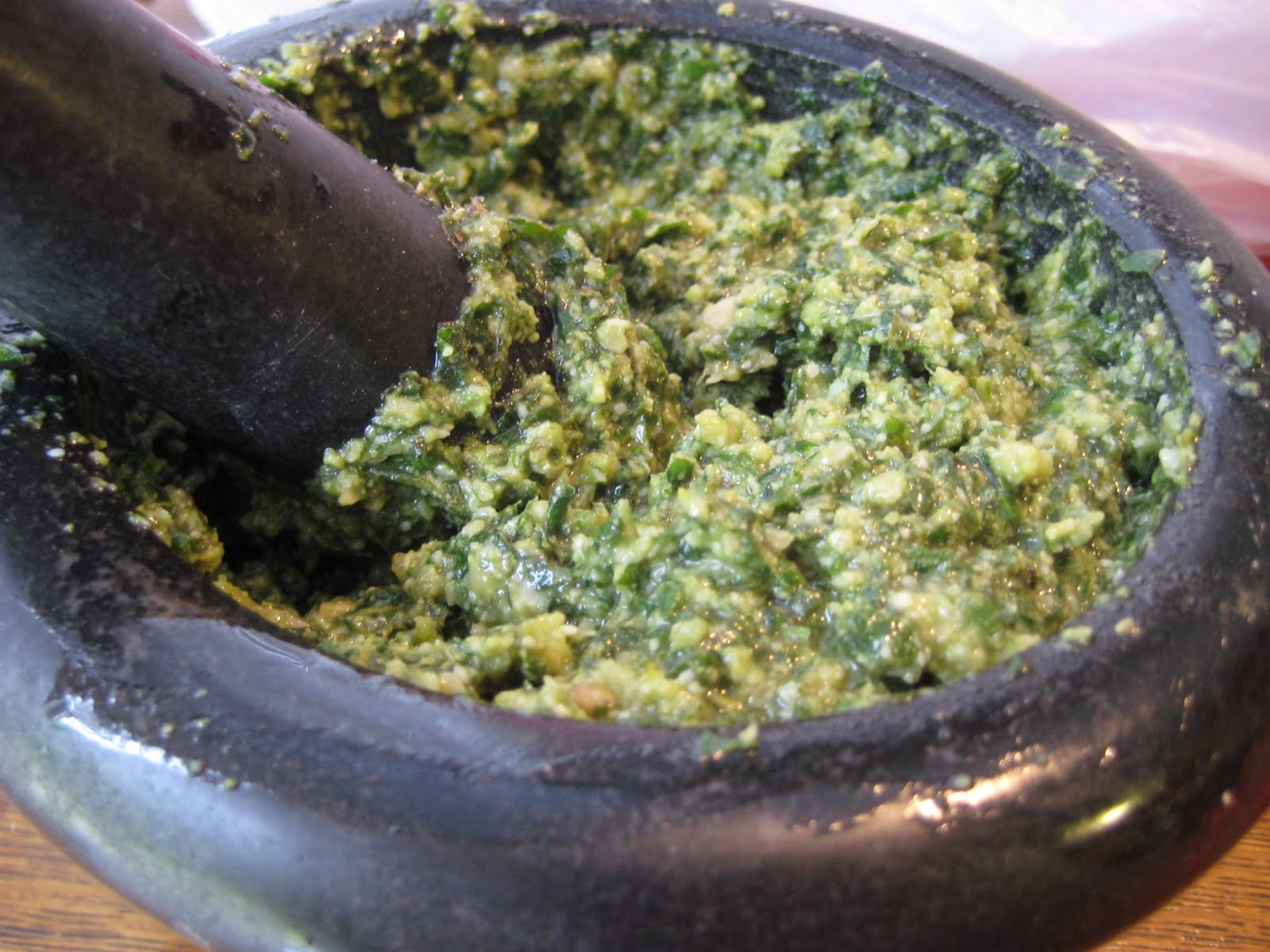 I made my pesto with a colander full of fresh basil, three large cloves of garlic, about one-fourth a cup of olive oil, parmesean cheese, and pine nuts, a pinch of salt and pepper. I didn’t measure anything, but just tasted as I went. I pulsed it in the mini-food processor and then used the mortar and pestle for a little extra smoothing and a nice photo op.