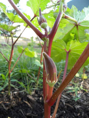 Left to right: huge tomato, Silver Queen corn, garlic, cantaloupe, red okra