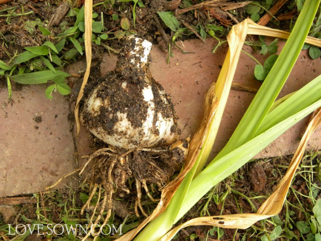 While some people like to braid their garlic and hang it to dry, I like to wash mine off and let them dry on a paper towel in the kitchen. The soil isn’t lose enough to pull up the garlic by the green, and I had to dig this one out with a shovel when the stalk snapped off.