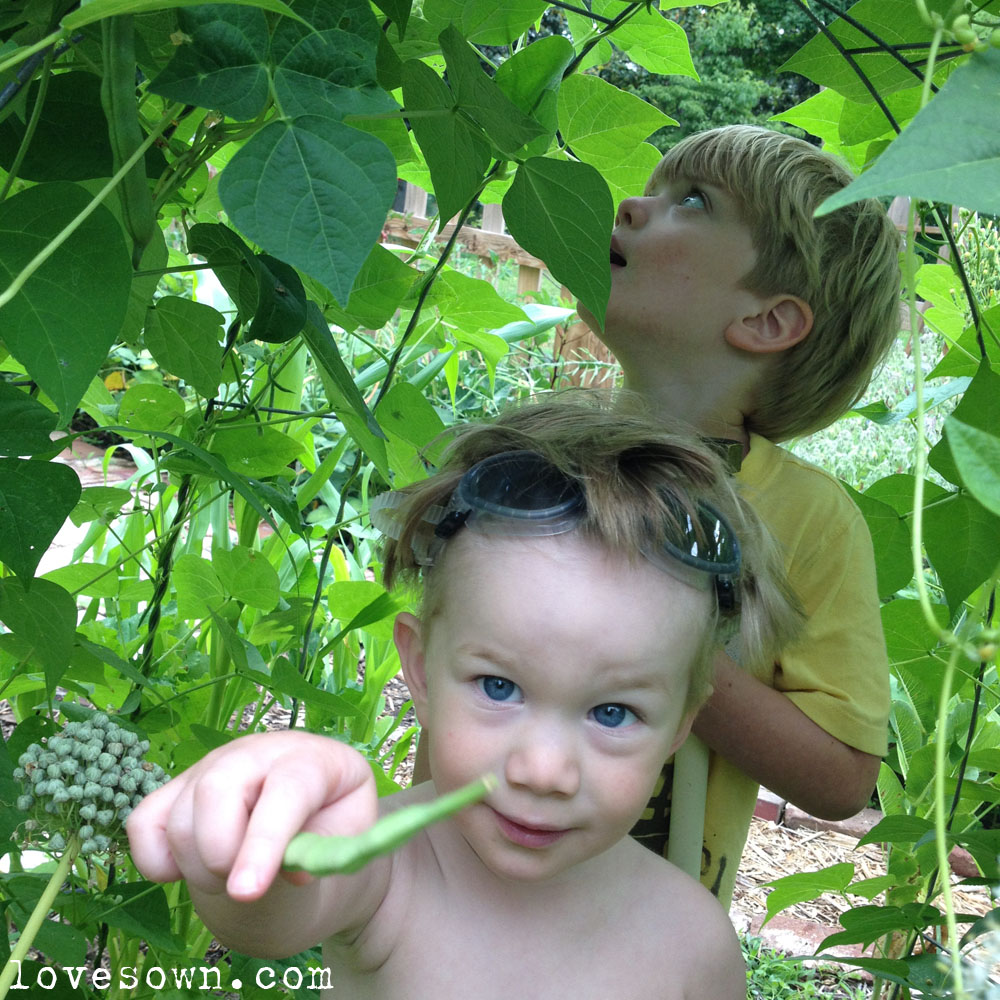 This brings us to beans. Our garden is jam-packed with pole beans, bush beans, edamame, peas, and a variety of other beans we plan on harvesting to dry. I like that the legumes return nitrogen to the soil, and I like that they are easy to enjoy. They also make for tantalizing picking for the boys. Their garden dome is now fully draped in bean vines, and new pods dangle down every couple days.