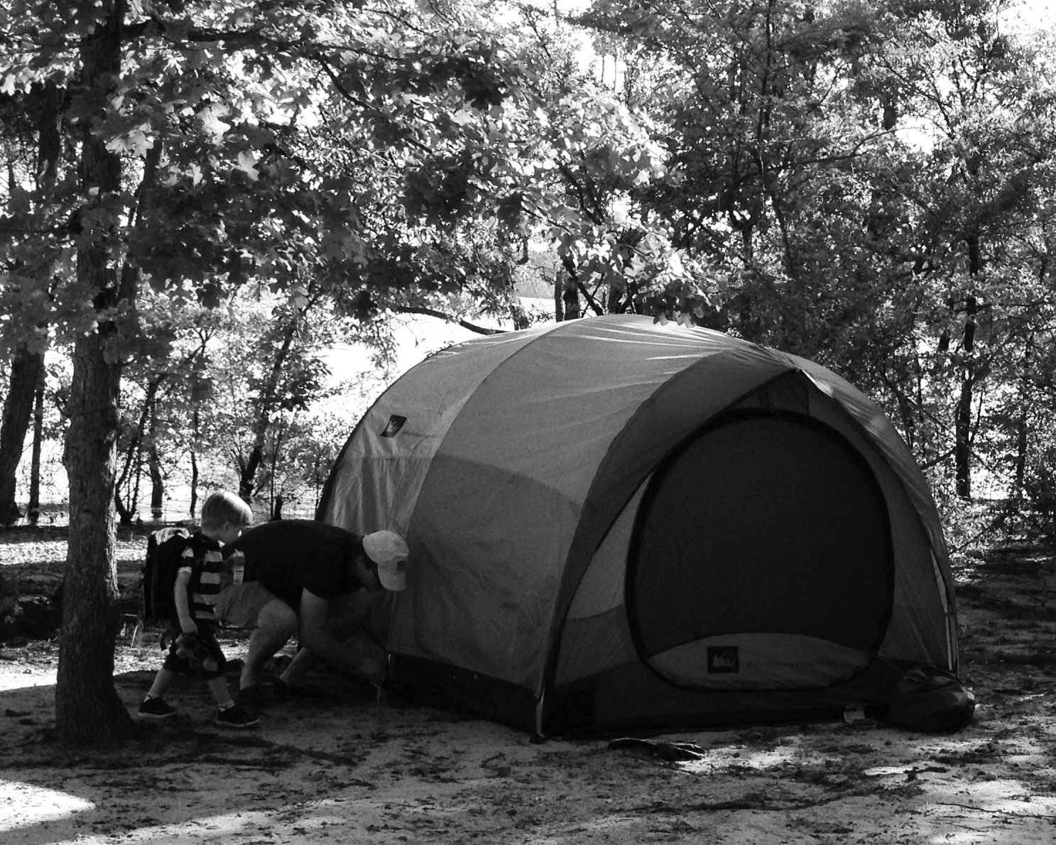 Equipped with a new tent, air mattresses, birthday brownies, and big wheels bikes tethered to the top of the Jeep, we managed to survive, even if we did trim the second night off the itinerary. The lake was very high, and the campground “kitchen” was underwater. This was one of the lesser flooded campgrounds around the lake, which is owned by the US Army Corps of Engineers and leased to North Carolina State Parks and Virginia State Parks. Although we brought two tents, we had all four of us in one tent. Joe