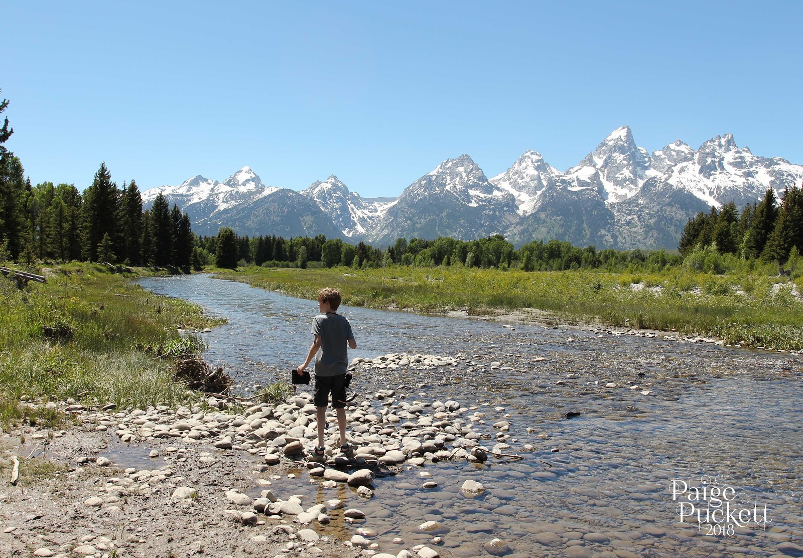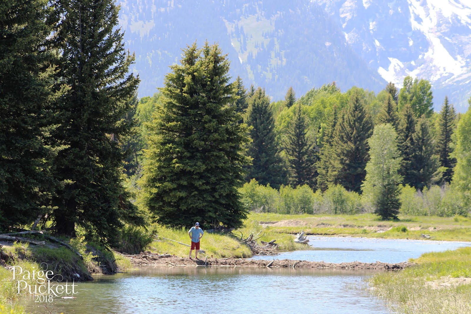 Part of the excitement of this trip out west was not having every hour of every day planned out. There were several spots we wanted to make time to hit, but there was enough flexibility on our drives for impromptu stops. I’m fairly certain you could make an entire trip composed of nothing but impromtu stops in the Tetons and Yellowstone. We pulled over several times in Idaho for wildlife and Oregon Trail historic landmarks. Schwabacher Landing was a spot that grabbed our interest when we initially sketched out a loose itinerary. On the drive into the Tetons, we spotted the sign for a pull-off and, at the end of a gravel road, came across this beautiful view. It wasn’t crowded, as we had the river to ourselves, but down in the gravel lot there was an artist with an easel behind her truck and several fly fisherman coming and going from somewhere downstream.