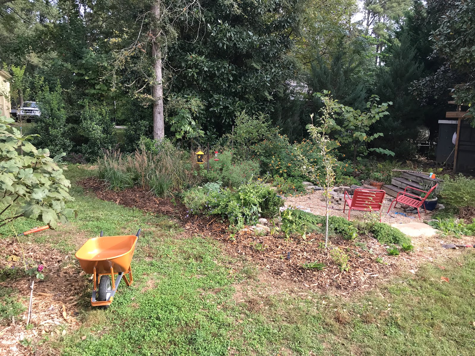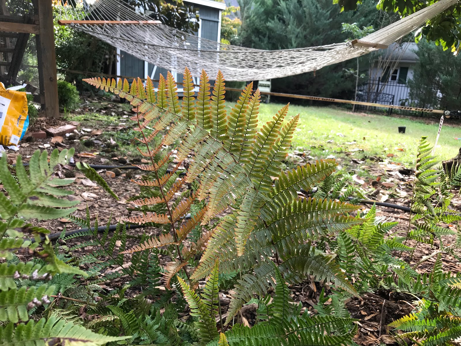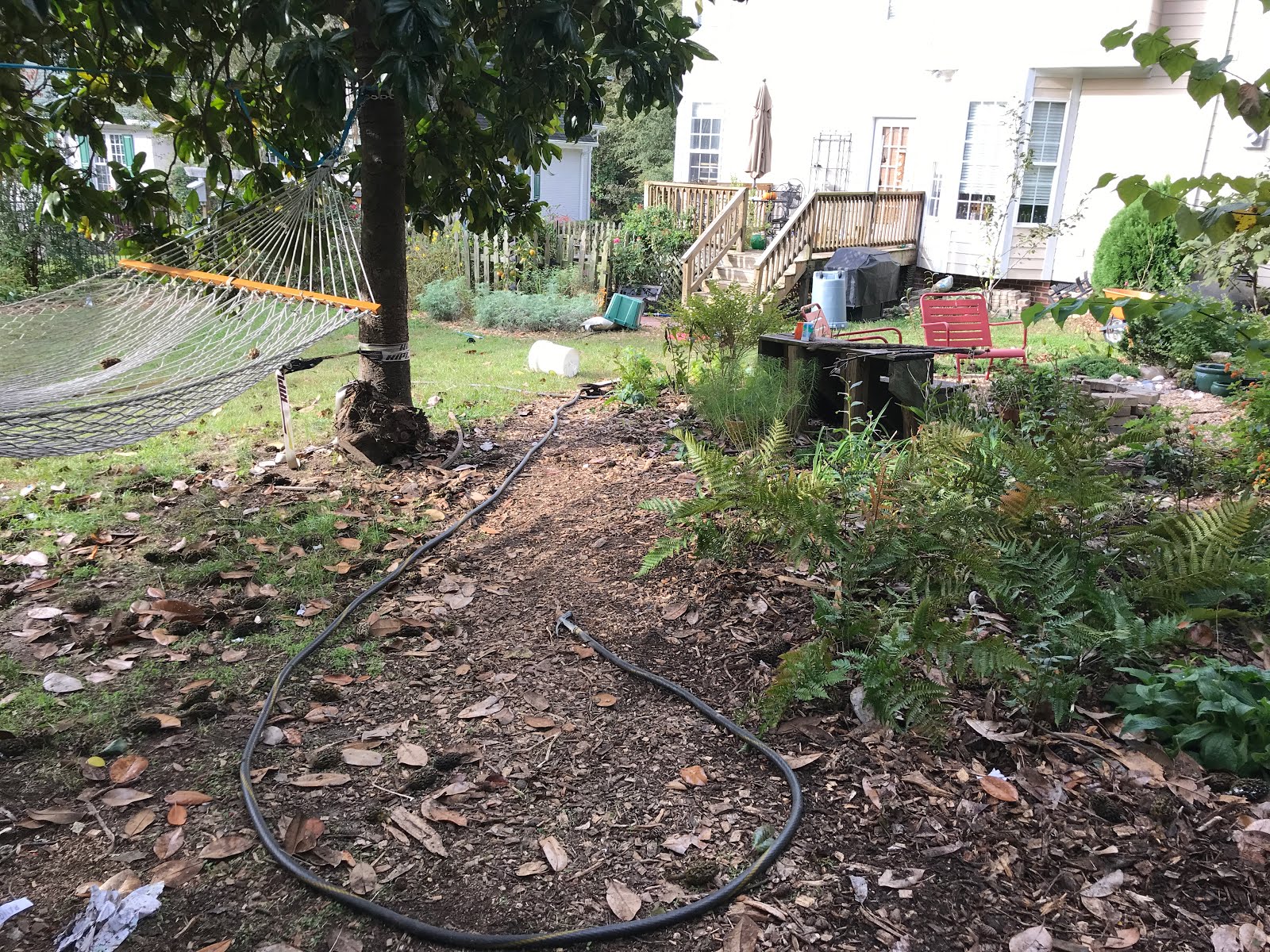 As the Autumn ferns have grown very dense, I split them up and extended the bed next to the hammock while moving the bench to another shady part of the yard. This is starting to carry the feel of some of our hikes in parks, even if these Autumn ferns a not native to the area. Maybe some day I’ll replace these ferns and grasses with native species.